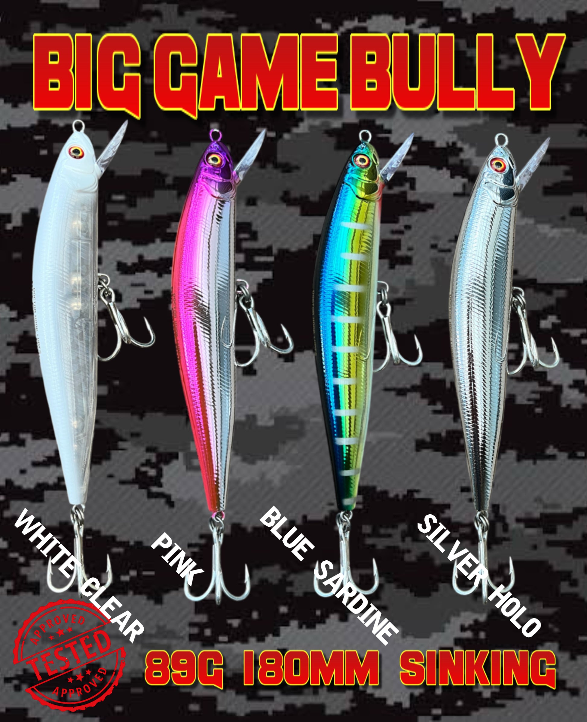 The Big Game Bully is through wired for extra strength and durability. At 89 grams and 180mm, rigged with large treble hooks, it's a great option for attracting those big fish!